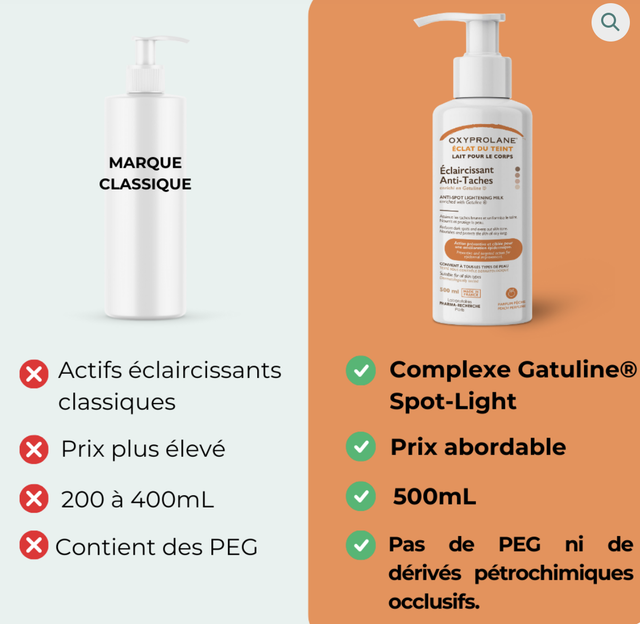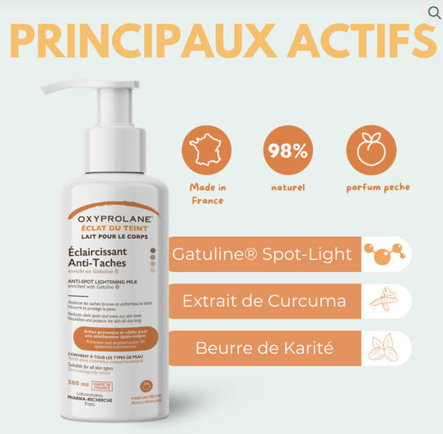 Le Lait Éclaircissant & Hydratant OXYPROLANE® incarne une synergie unique d’actifs – Gatuline® Spot-Light, curcuma et beurre de karité. Conçu pour révéler l’éclat naturel de la peau tout en la nourrissant en profondeur, ce lait agit efficacement sur les taches pigmentaires, hydrate intensément et protège des agressions extérieures. Son parfum délicat offrent une expérience sensorielle. Les résultats sont visibles dès les premières applications : un teint lumineux, plus uniforme, une peau douce, rebondie et confortablement hydratée.